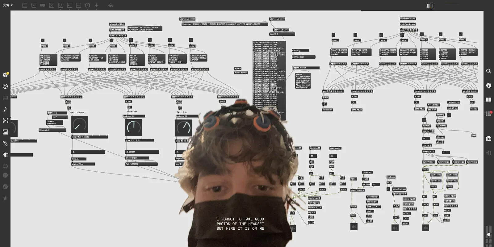 For our electronic and computer music programming final, my group built an interactive sound art piece controlled by live electroencephalogram (EEG) data streamed in from a headset worn by the listener. Written primarily in Max MSP, the piece consists of four distinct soundscapes, each independently responsive to fluctuations in the intensity of activity in the listener’s Alpha, Beta, Gamma, Delta, and Theta EEG bands. The listener is able to transition between these various soundscapes by attaining and holding steady on target focus states while guided (or interfered with) by the qualities of the sounds themselves.